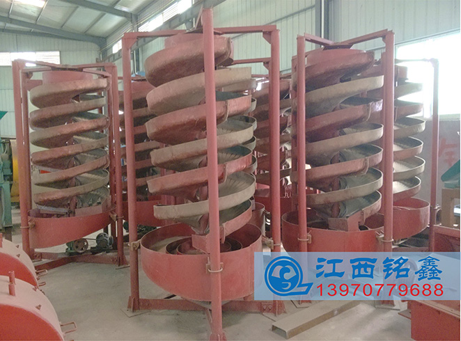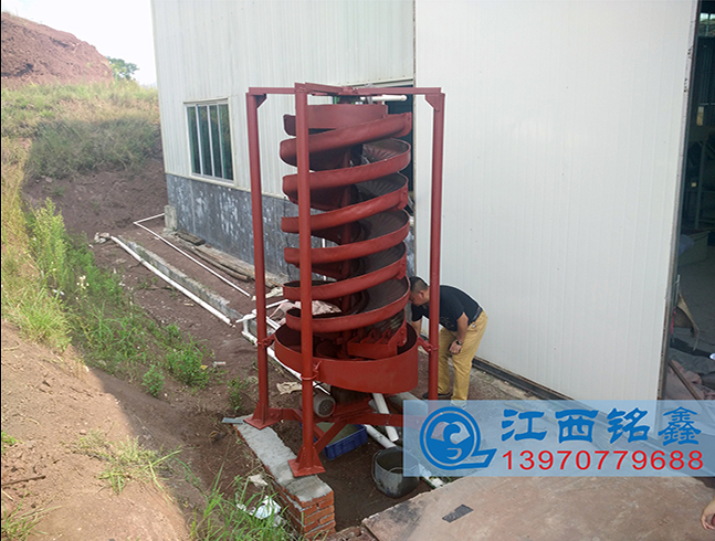 促使給礦更快的分帶,輕、重礦物運動軌跡差異明顯,分選效果優于一般固定螺旋溜槽或螺旋選礦機。富集比高,有效分選粒度范圍為0.6~0.05毫米,粒度回收下限略高于螺旋溜槽。