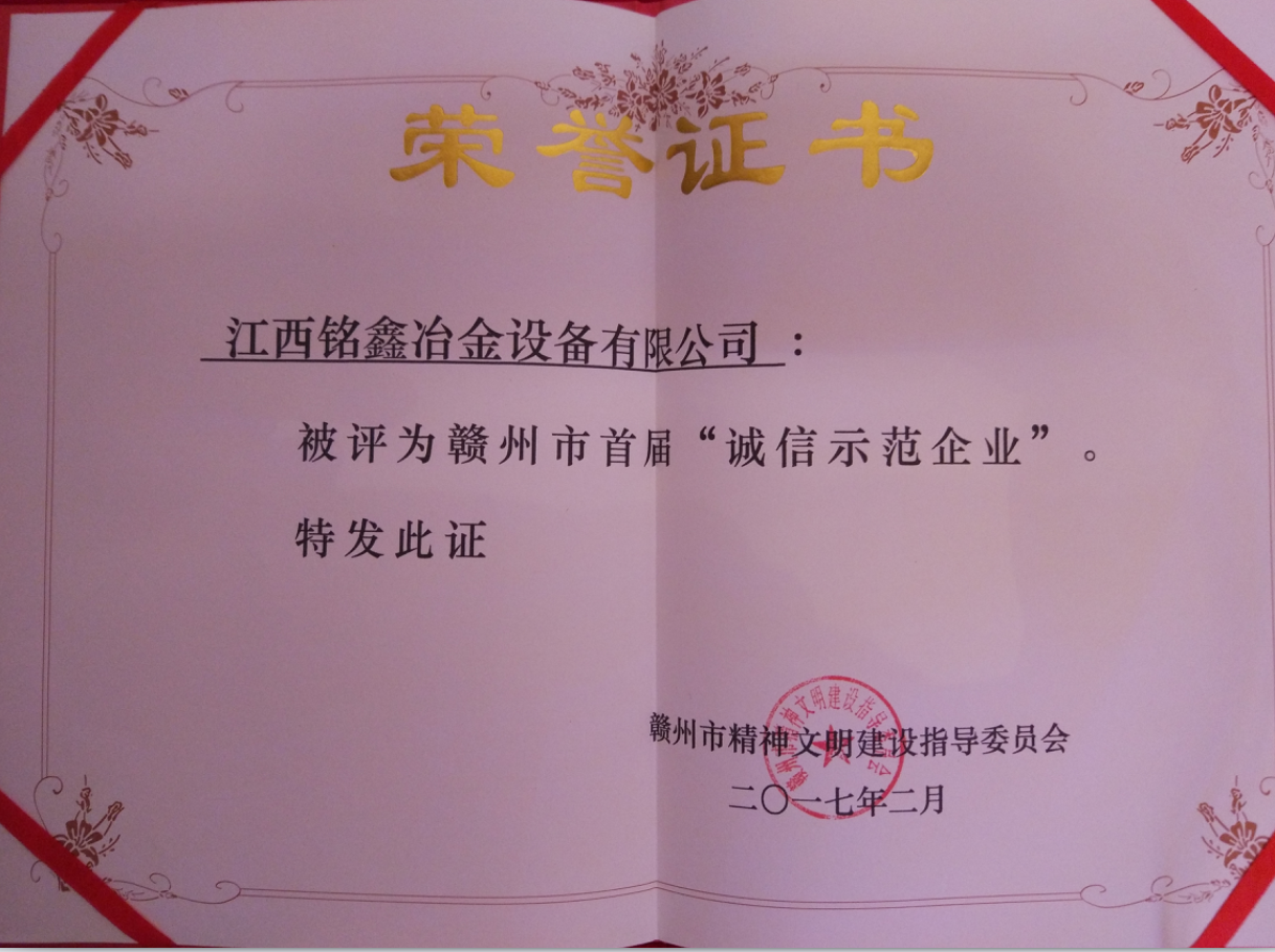根據(jù)贛州市文明辦《關(guān)于印發(fā)<贛州首屆百家“誠(chéng)信示范企業(yè)”評(píng)選活動(dòng)方案>的通知》(贛市文明辦[2016]42號(hào)),經(jīng)過(guò)各地各部門(mén)各單位評(píng)議推薦和評(píng)選活動(dòng)組委會(huì)審核,江西銘鑫冶金設(shè)備有限公司等65家企業(yè)入圍了贛州市首屆 “誠(chéng)信示范企業(yè)”。