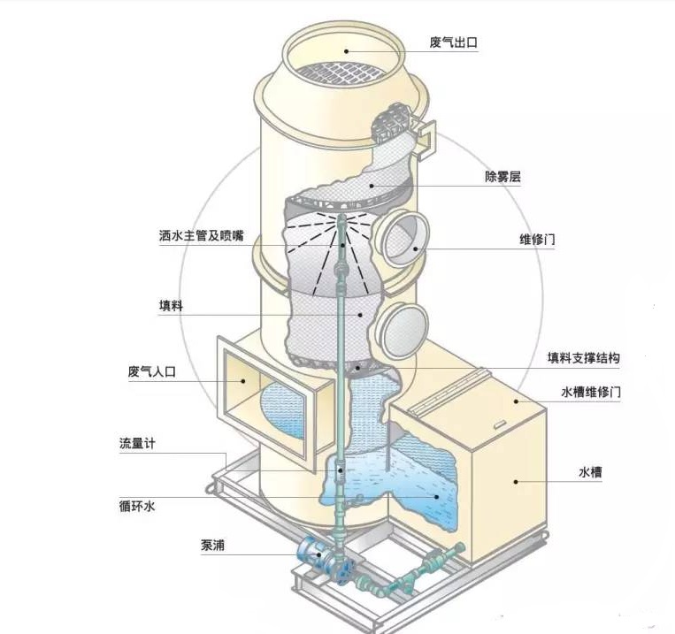 酸霧廢氣由風管引入凈化塔,經過填料層,廢氣與氫氧化鈉吸收液進行氣液兩相充分接觸吸收中和反應,酸霧廢氣經過凈化后,再經除霧板脫水除霧后由風機排入大氣。吸收液在塔底經水泵增壓后在塔頂噴淋而下,最后回流至塔底循環使用。凈化后的酸霧廢氣達到廣東省地方排放標準的排放要求,低于國家排放標準。