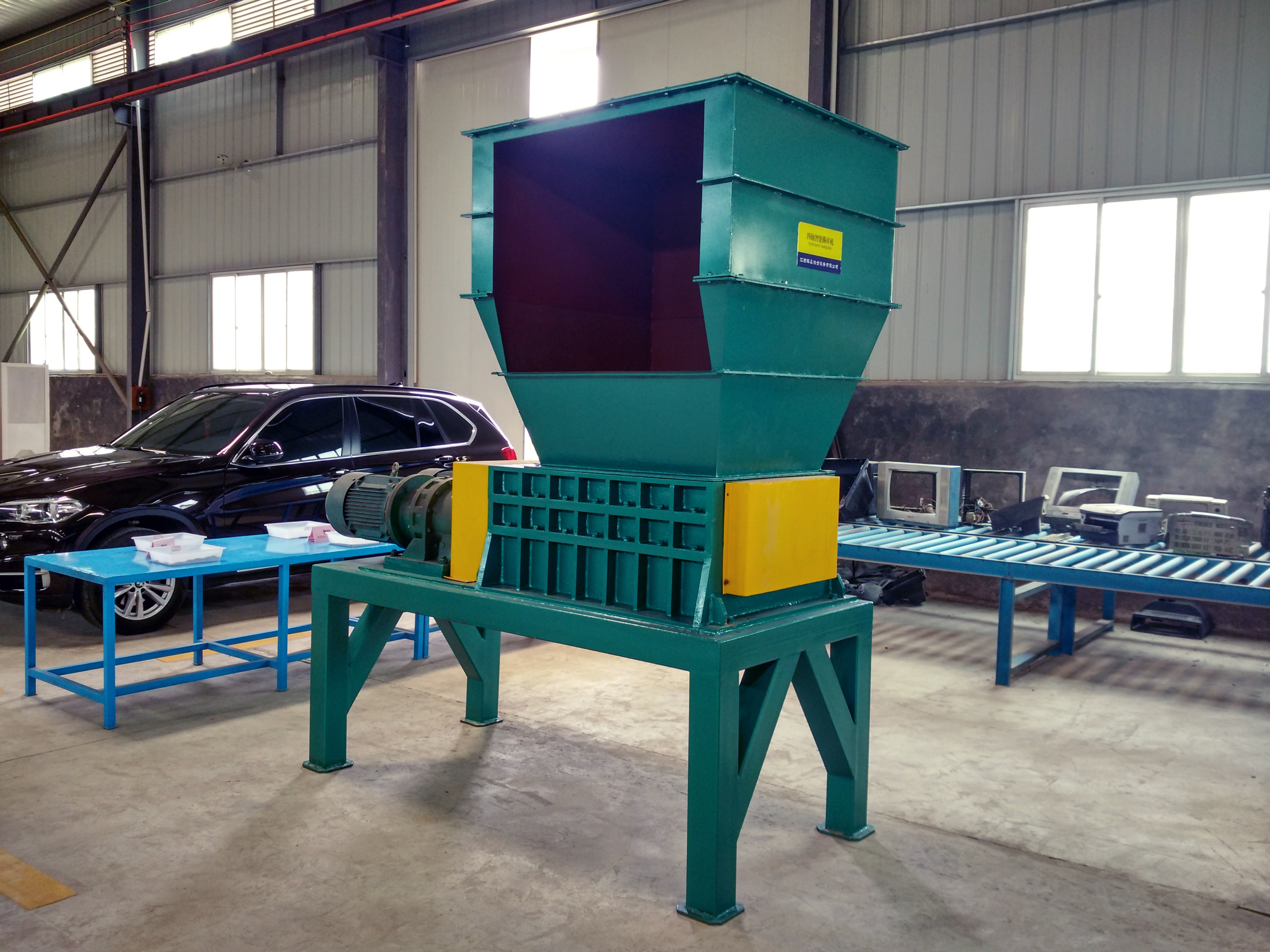該機設計新穎、噪音低、扭矩大、用途廣,在破碎過程中,具有拉切、扯斷、擠壓、自動退料,能使各種塑料、廢電線、電纜、印刷電路板、廢舊冰箱、洗衣機、空調、電視、電腦等家電及打印機、復印機、傳真機等辦公用品。廢舊橡膠、工程樹脂、城市廢物、木材、管材、粗大塊料破碎之用,每小時處理量1-10噸。
